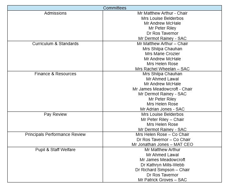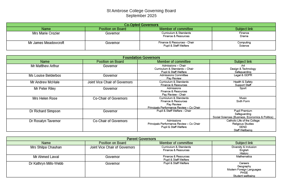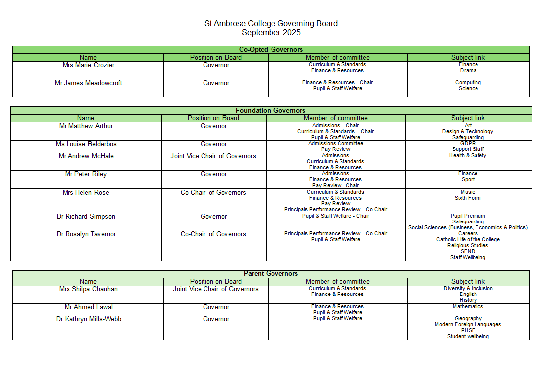 In addition to being a member of the full Governing Body, Governors take on 'link positions' generally covering an area of personal expertise and assist the school's senior leadership team.